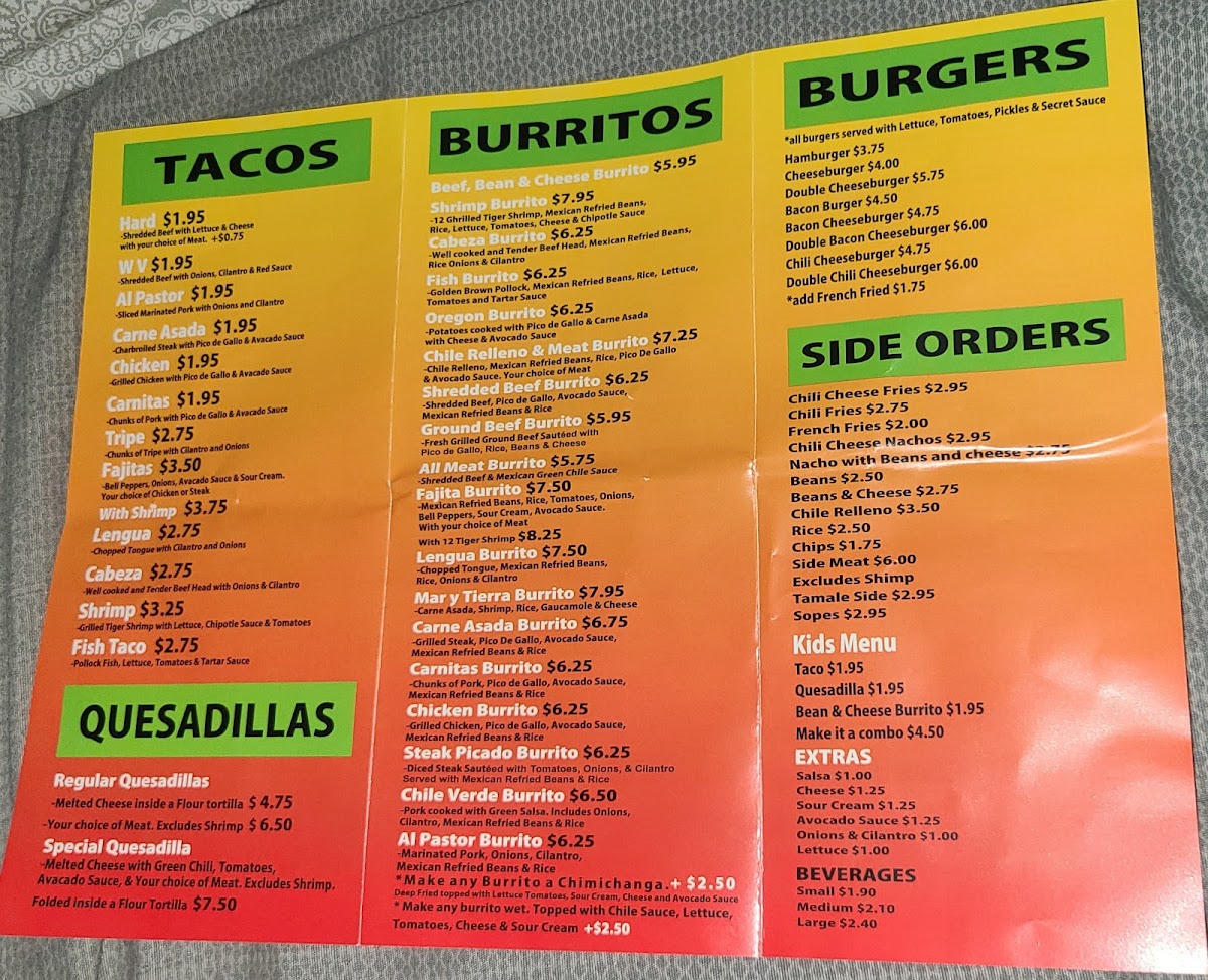 You’ll find a variety of burritos, tacos, and plates that deliver familiar flavors with just the right balance of spice and freshness. Highlights like the Carne Asada Burrito, Oregon Burrito, and Shrimp Burrito stand out as flavorful options, while quesadillas and chimichangas offer comforting, cheesy bites. The menu also includes vegetarian-friendly choices, making it easy to find something for everyone.